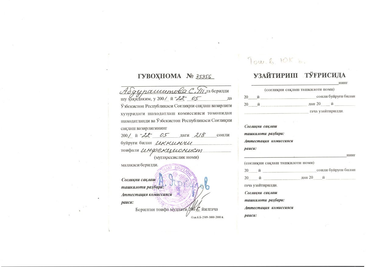 • 1994-2000 гг. – Ташкентская городская инфекционная больница, врач-инфекционист;