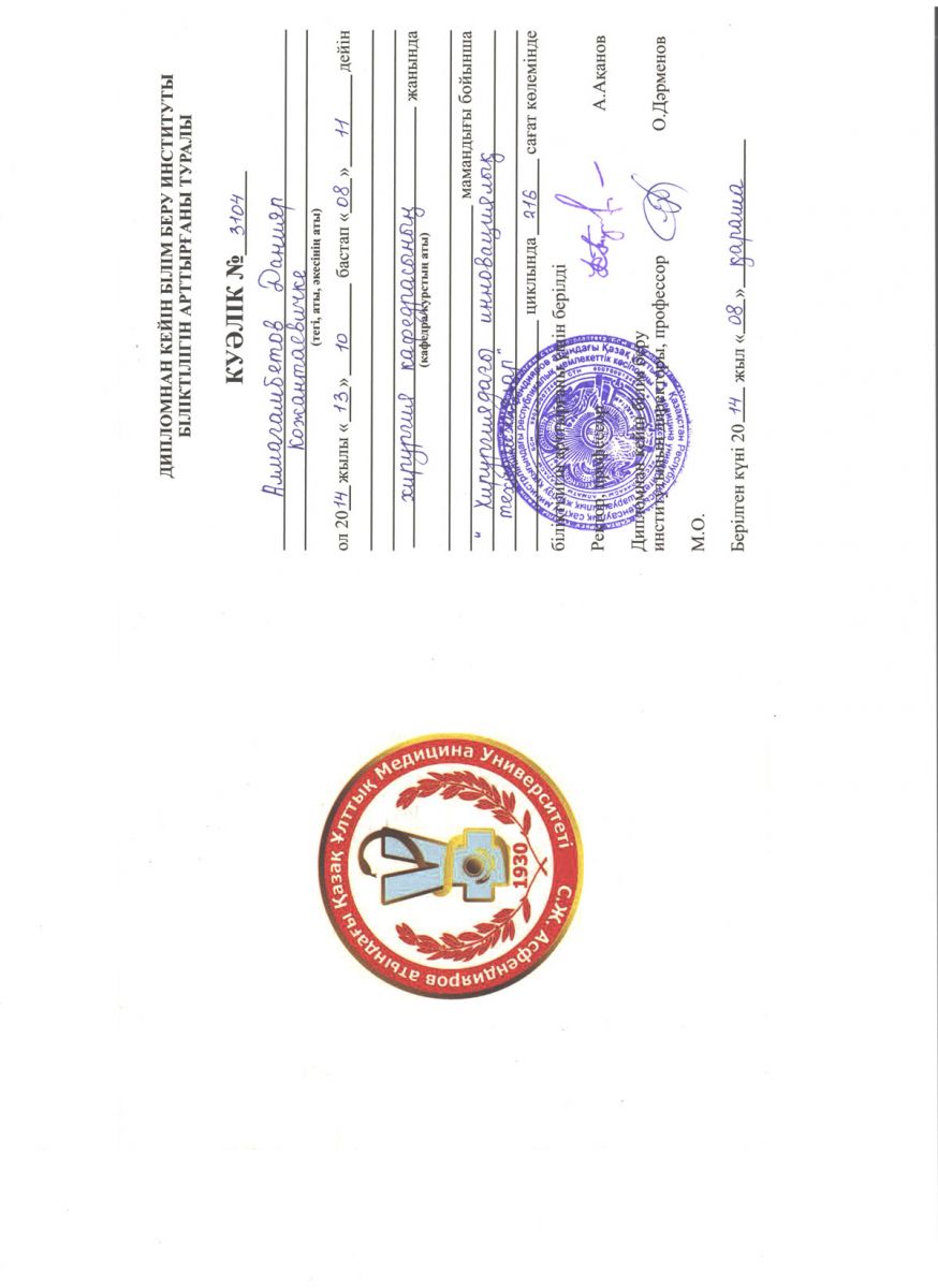 • 2008 - 2009 гг. - Казахстанский медицинский университет, Интернатура на базе госпиталя мвд отделение хирургии