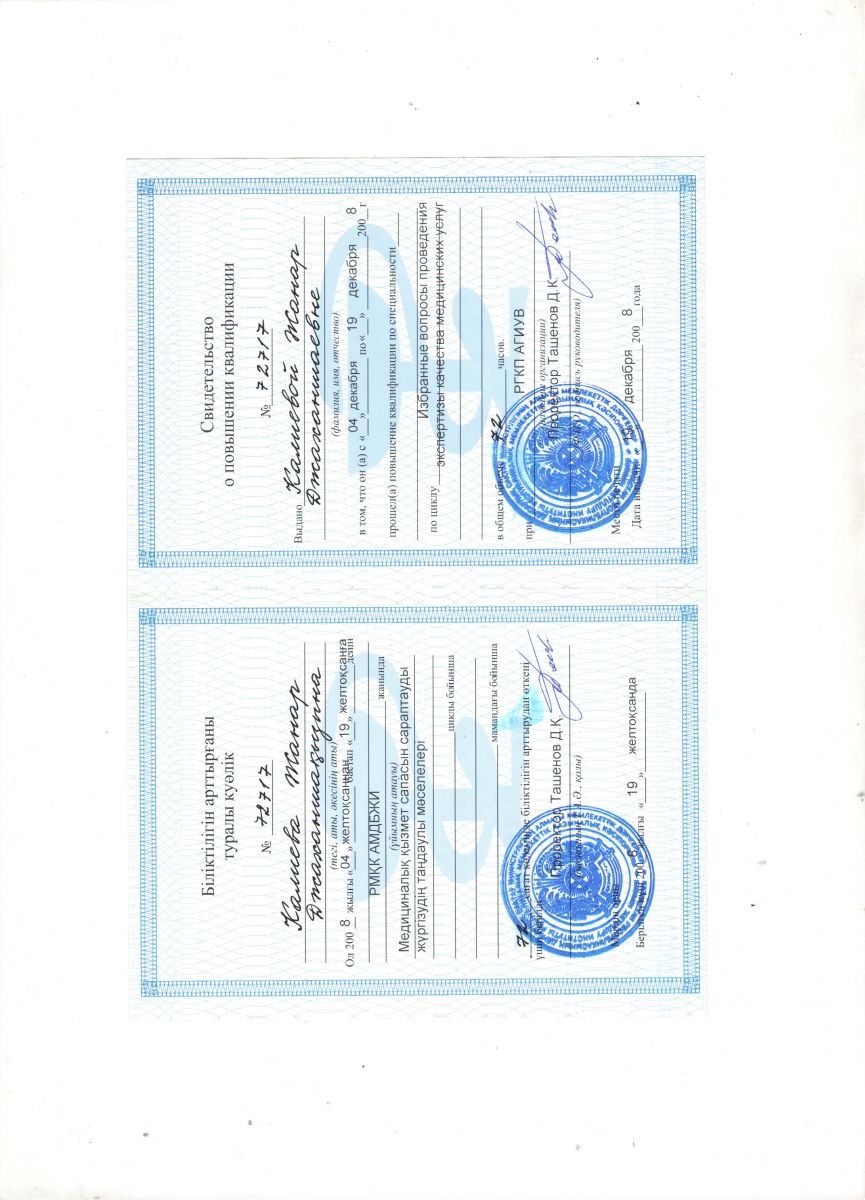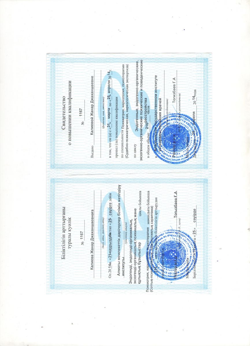 1993 -1994гг. Алматинский государственный медицинский институт, аспирантура по специальности - клиническая фармакология
