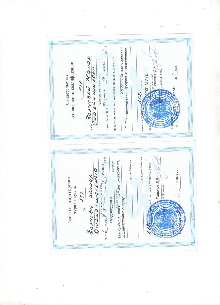 2009г. повышение квалификации в АГИУВ по циклу «Алкоголизм, наркомании, и токсикомании. Профилактика и лечение»