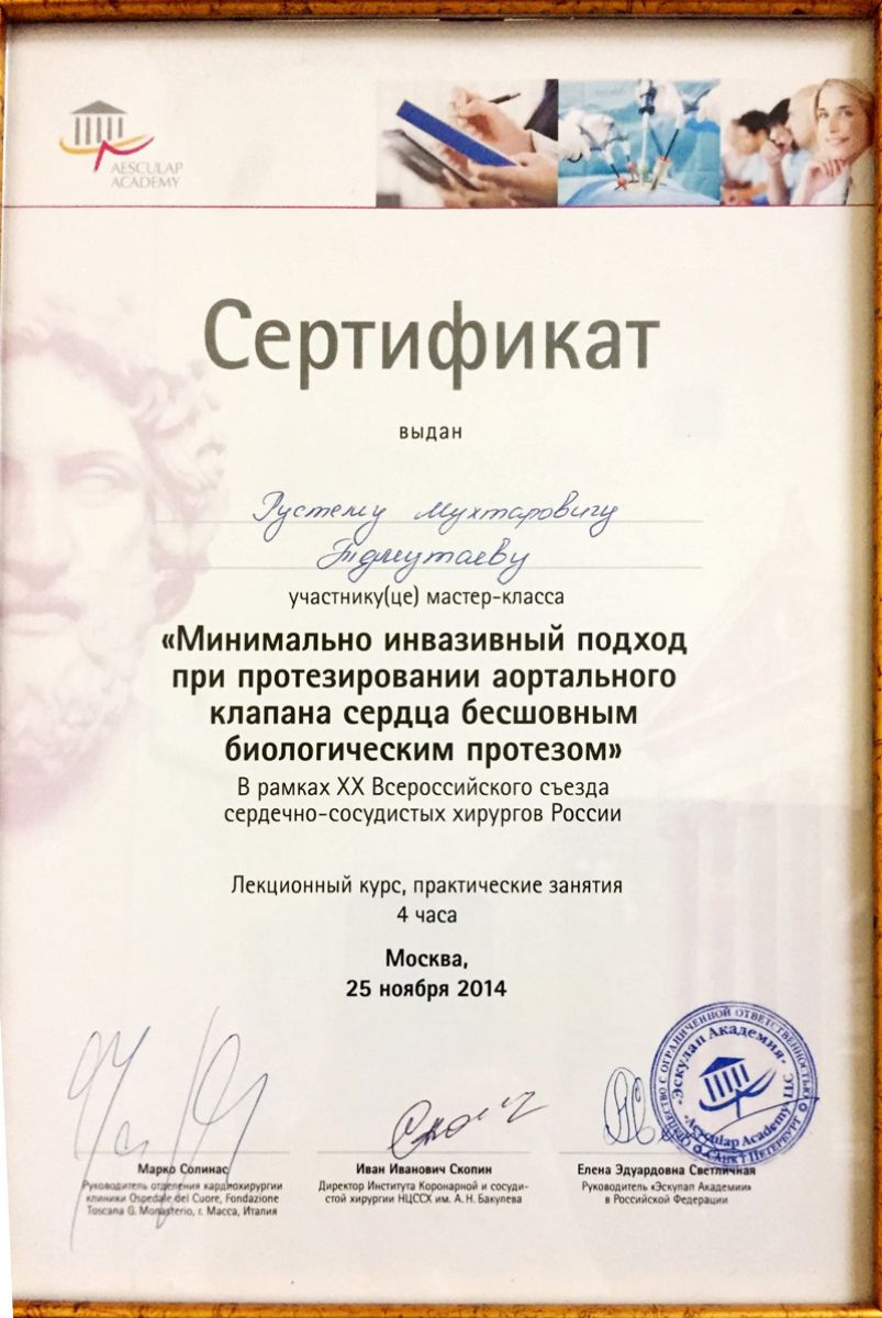 - 2014 г. – курсы по минимально инвазивной хирургии аортального клапана (Москва, РФ);