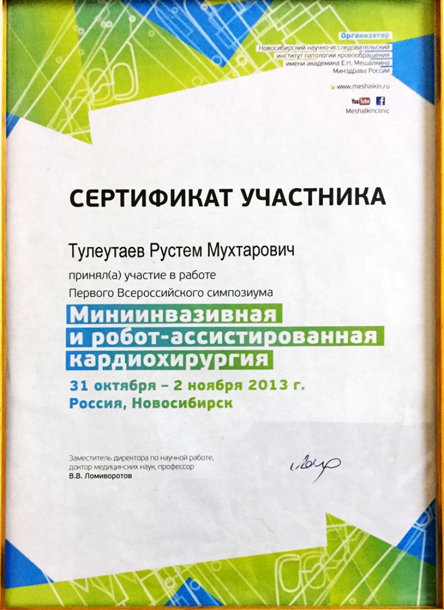 - 2013 г. – тренинг-курс по реконструктивной хирургии митрального клапана (Вена, Австрия);