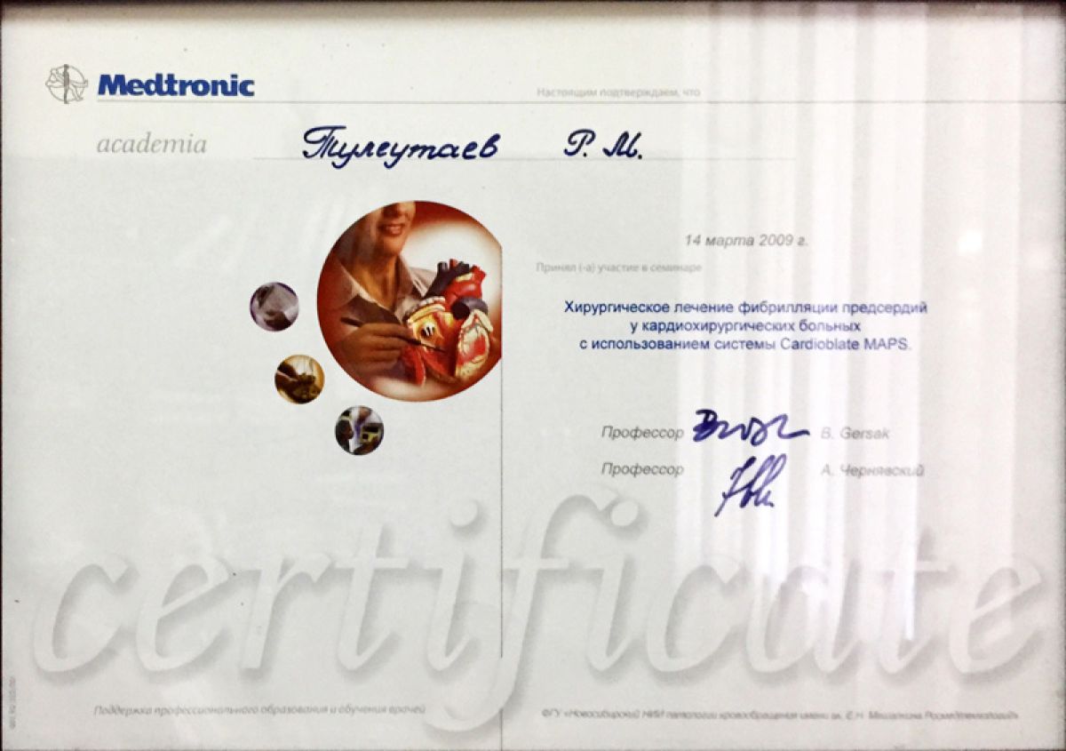 - 2009 г. – курс усовершенствования по хирургическому лечению фибрилляций предсердий у кардиохирургических больных с использованием системы Cardioblate MAPS (Новосибирск, РФ);
