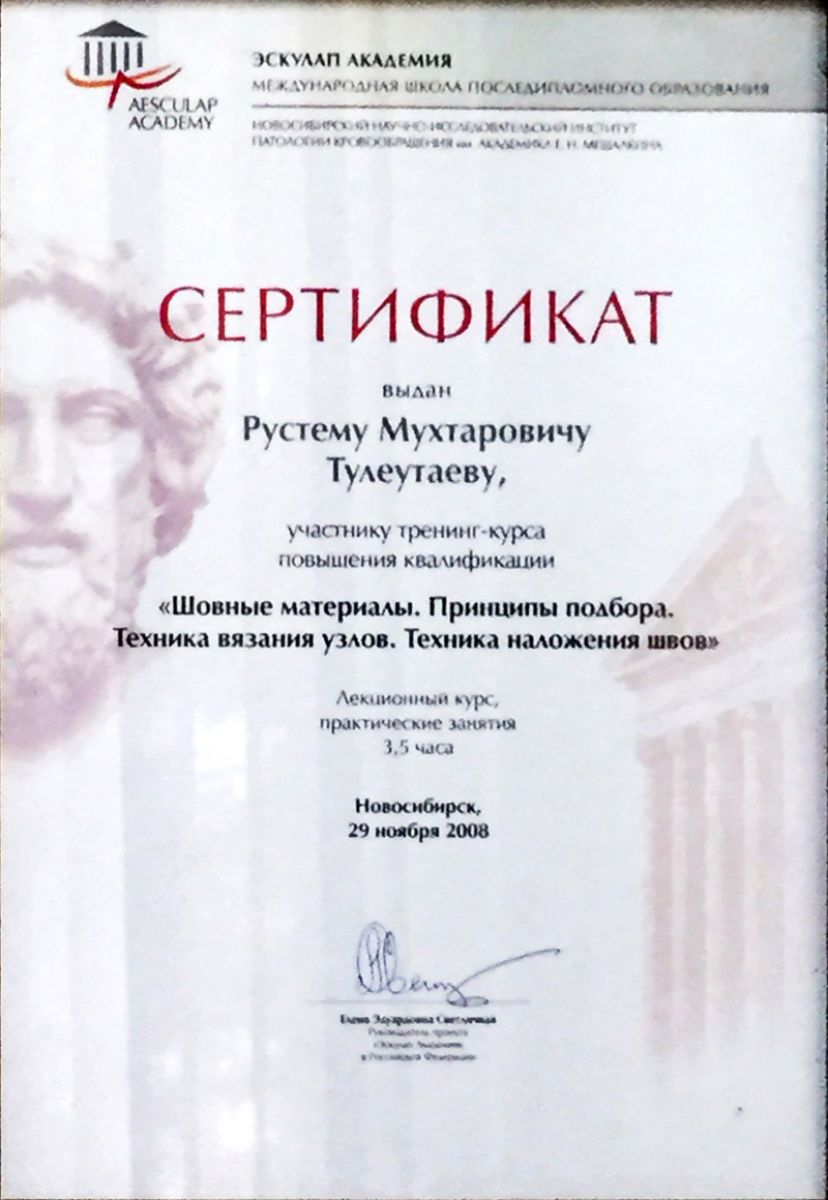 - 2008 г. – семинар-тренинг «Шовные материалы. Принципы подбора. Техника вязания узлов. Техника наложения швов. Эскулап – академия» (Новосибирск, РФ);