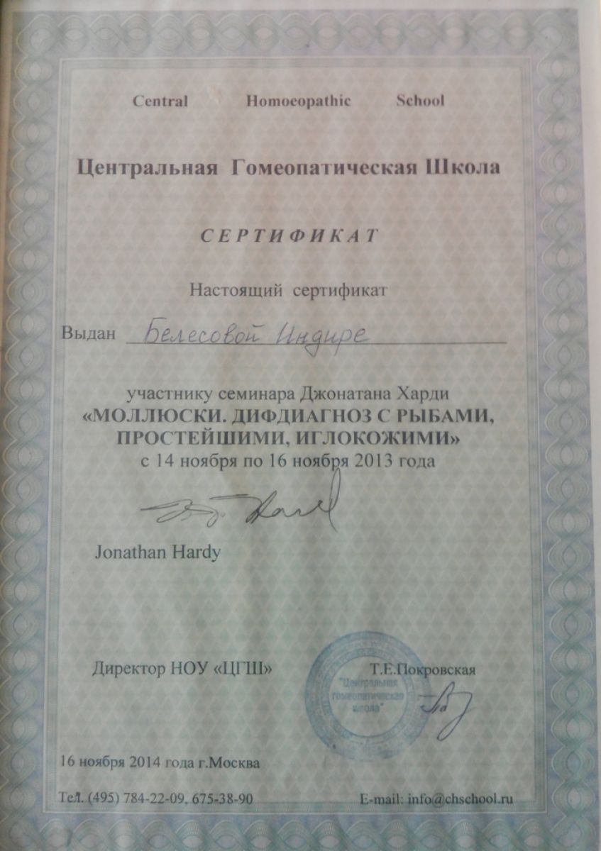 2013 ж. – Джонатан Харди гомеопатиялық семинары «Ұлулар, балықтармен, қарапайымдармен, теңіз жұлдыздарымен дифдиагноз» тақырыбында, (Мәскеу, РФ);