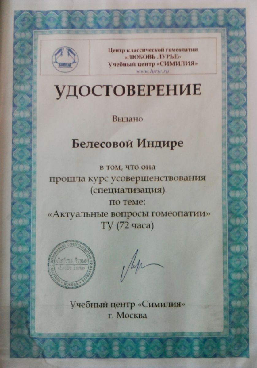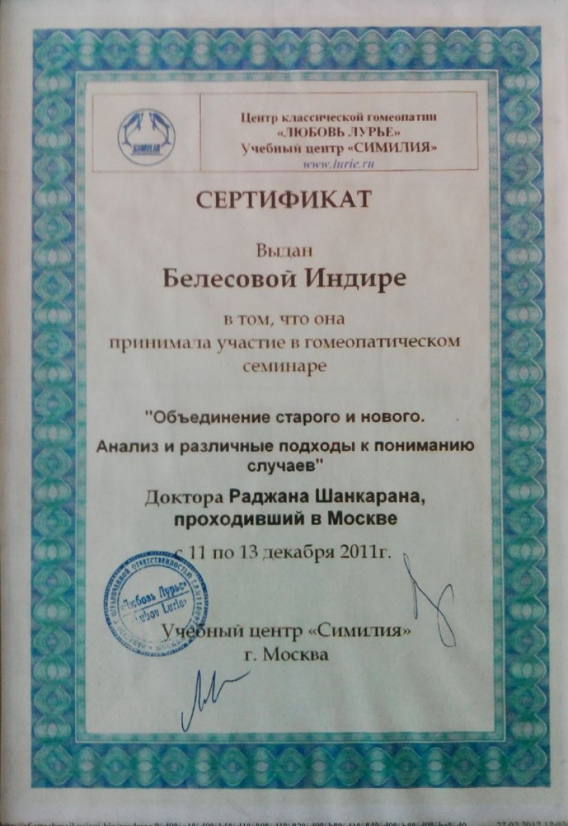 2011 ж. – дәрігер-гомеопаттар үшін классикалық гомеопатия бойынша біліктілікті арттыру (Мәскеу, РФ);