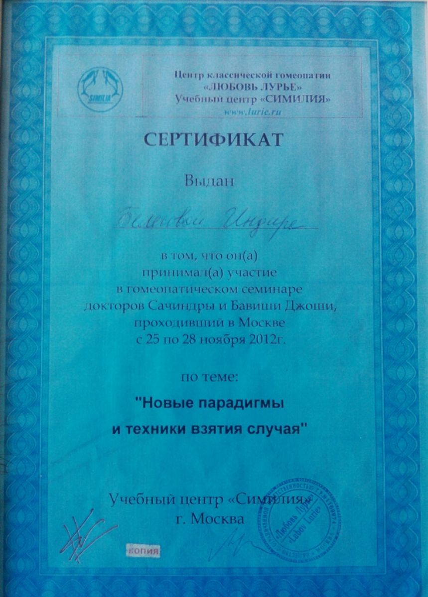 2012 ж. – докторлар Сачиндра және Бавиши Джошилердің «Жаңа парадигмалар мен жағдайларды алу әдістері» тақырыбындағы гомеопатиялық семинар (Мәскеу, РФ);