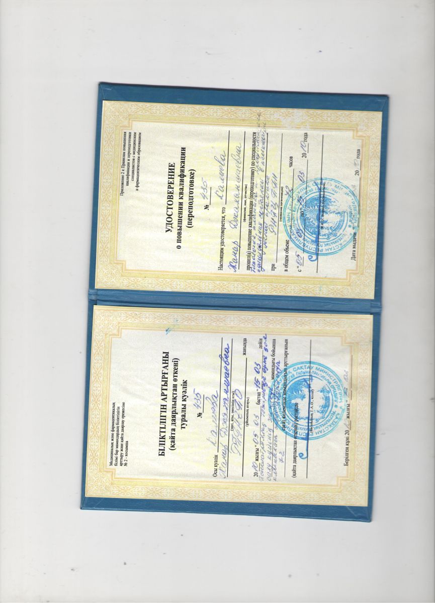 2015 ж. «Медициналық ұйымдар мен ғылымдар оқытушысы» цикл бойынша Қазақ үзіліссіз медициналық білім беру институты.
