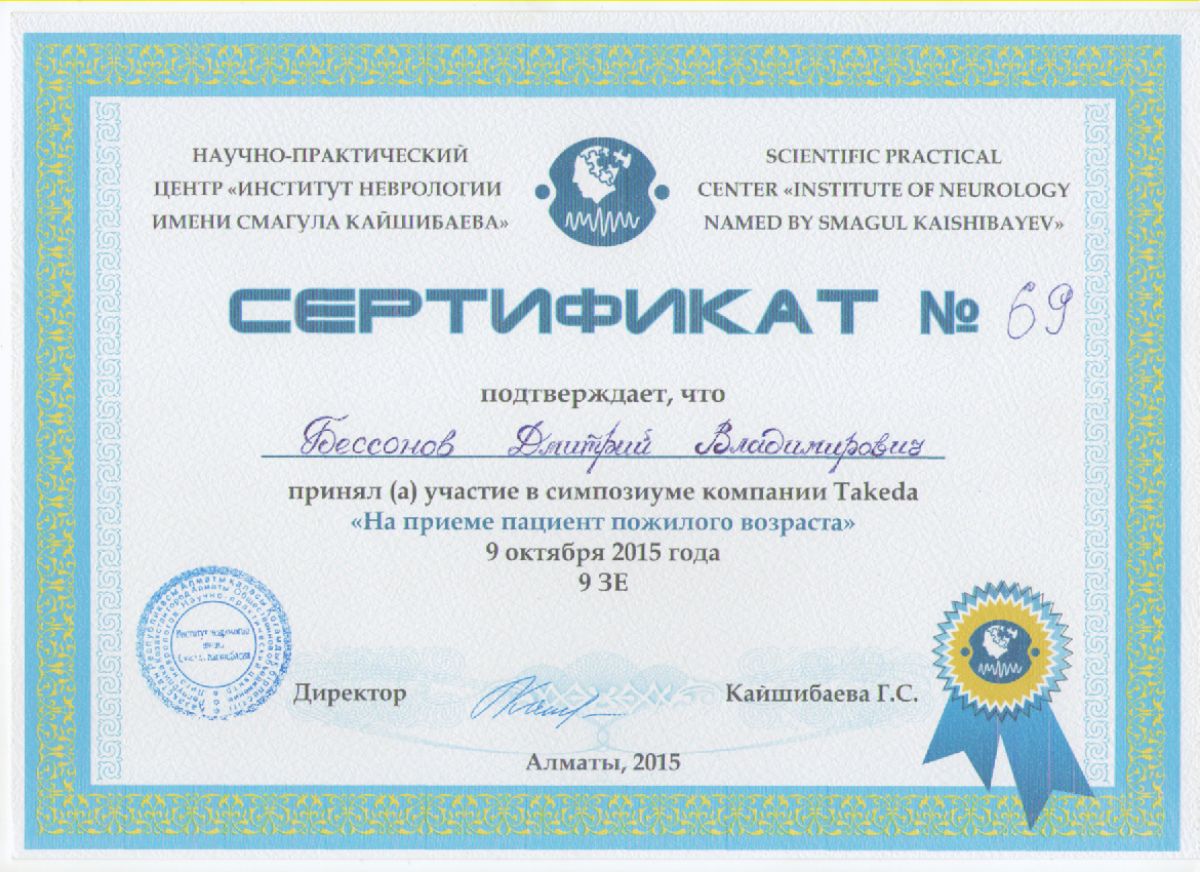 • 2015 ж. – КазМУНО, қайта даярлау, «Дәстүрлі терапия (рефлексотерапия, мануалды терапия, су-джок-терапия, гомеопатия, гирудотерапия, фитотерапия)»;